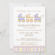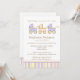 Dreifache Freude! Das ist die Ankündigung auf dieser Baby Dusche Einladung, die mit ansprechenden rosa und blauen Babywagen mit rosa, blau, gelb und bräunlichen Streifen auf einem weißen Hintergrund.