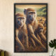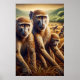 Drei energetische Affen vergnügen sich spielerisch in einem üppig grünen Feld, ihre lebendige Antik in einem lebendigen Bild mit Farben und Bewegung eingefangen.