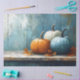 Ein gemütliches, im Herbst inspiriert impressionistisches Gemälde mit drei Kürbis, orange, weiß und blau, das sich auf einem verwitterten Holztisch ausruht. Warme Herbstlaube und strukturierte Pinselstriche verleihen dem rustikalen Bauernhof seinen Charme.