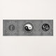 Drei silberne Sechseck-Mandalase auf grauem Holzfußboden, jedes mit einem silbernen OM-Symbol, einem Yin-Yang-Symbol und auf der dritten Mandala das Wort namaste. Rustikale Zen-Magie