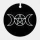 Mit diesem runden Weihnachtsschmuck mit einem auffallenden, weißen Triple Moon Pentagramm und einem fett schwarzen Hintergrund fügt sich Ihr Urlaubsstil in eine Touch himmlischer Magie ein. Das Tripelmondsymbol, das den Maiden, die Mutter und den Krone repräsentiert, ist ein mächtiges Emblem der Göttin und der zyklischen Beschaffenheit des Lebens und macht dieses Ornament zu einer sinnvollen Ergänzung der Hexensammlung. Dieses Ornament ist perfekt für diejenigen, die Wicca, Hexerei oder heidnische Traditionen praktizieren, und symbolisiert wunderbar die Mondphasen und die Verbindung zur göttlichen Weiblichkeit. Es ist ein ideales Geschenk für jeden, der sich die Geheimnisse der Mondphasen zu eigen macht, die Göttin ehrt oder die Schönheit der Magie in ihrem Leben feiert. Dieses bezaubernde Ornament verbindet das Mystische mit dem Festlichen und macht es zu einer einzigartigen Dekoration für Ihren Weihnachtsbaum oder heiligen Platz. Ob Sie eine Hexe, ein Heide oder einfach jemand, der die spirituelle Symbolik schätzt, dieses Stück fügt der Ferienzeit eine Touch Magie hinzu.