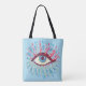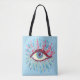 Psychedelisches Auge auf der ganzen aufgedruckten Tasche mit einer bunten Abbildung eines bizarren blauen Auges mit großen, gekämmten rosa Wimpern, hellblauen Tränen, die überall fließen und viele rosa und grüne Elemente - Erweiterungen der Wimpern.