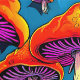 Farbenfrohe, lebendige Vintage Pilze mit einem psychedelischen Muster in blau, orange und gelb.