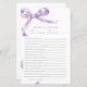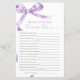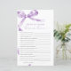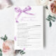 Lavendel "Trivia For Bride And Groom" Spiel - Verbringen Sie Spaß beim Duschen Ihrer Paare mit dieser hübschen Spielkarte, die ein zartes lila Bugdesign bietet. Dieses Spiel "Trivia For Bride And Groom" eignet sich hervorragend, um Gäste zu begeistern und das Paar stilvoll zu feiern. Mit eleganten Drehbüchern und femininen Akzenten ist diese Spielkarte eine schöne Ergänzung zu jedem Duschthema für Paare. *** Bitte geben Sie H141 in den Shop Suche nach allen passenden Artikeln *** oder besuchen Sie unsere Lavender Bow Baby Shower Collection. *** Dieses hochwertige Design ist leicht an Ihre Duschfarben, -stile und -themen anzupassen. Für weitere Anpassungen klicken Sie bitte auf den Link "Edit using Design Tool" und verwenden Sie unser Designwerkzeug, um diese Vorlage zu ändern. Wenn Sie Hilfe oder passende Artikel benötigen, kontaktieren Sie mich bitte.