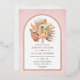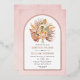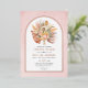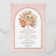 Weich rosa Bogen echte Rose Goldfolie Hochzeitseinladung mit tropisch getrockneten Palmen Blätter, Pampas Gras und Protea Blume. Auf einem weichen rosa farbenen Hintergrund wird ein Rahmen aus Rose mit goldenem Folienbogen platziert. Im Rahmen wird ein Blätter aus getrockneten Palmen, Protea-Blume und Pampas-Gras ausgestellt.