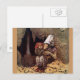 Farbenfrohe Abbildung von Muttertrollen, die ihr Kind mit Höhle und Lagerfeuer im Hintergrund halten. Illustration des schwedischen Künstlers John Bauer. "Trollunge pa Langtur"