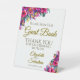Dieses schöne Schild lädt Ihre Hochzeitsgäste ein, Ihr Gästebuch zu unterschreiben. Das farbenfrohe Blumendesign mit Hibiskus-Blume, in warmen Rosa-, Fuchsien- und lila-Tönen, mit Monstera-Blätter und Paradiesvogel. Die Typografie beinhaltet elegante goldene Schriftzeichen, Platz für die Namen des Paares sowie das Hochzeitsdatum.