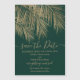 Moderne Goldpalme elegant Save the Date. Moderne, einfache Imitate Goldpalme mit einfacher Typografie, ein trendiges und Save the Date tropisches Hochzeitstil auf Palmenblättern mit bearbeitbarem dunklem Grün.