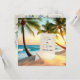 Ein leeres Einladungspapier mit einer Umschlagpapier-Erholung auf einem Sandstrand vor dem Hintergrund sanft schwingender Palmen und einem ruhigen Ozean unter einem pulsierenden Sonnenuntergang für einen Rett Unser Datum Hochzeitsziel. Alle Texte können geändert werden.