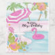 Niedliche Aquarellmalerei eines Schwimmbades mit einer rosa Flamingo-Floatie, tropischen Blume und Palmen. Nutzen Sie es für eine Geburtstagsfeier, ein Brautparty, ein Party, eine Wiedersehen oder einen tropischen Aufenthalt