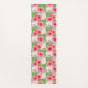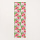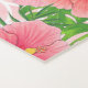 Farbenfrohe Gestaltung mit tropisch rosa Hibiskus Blume, Farne und tropischen Blätter auf hellrosa und weiß geometrischen Mustern Hintergrund.