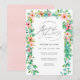 Das Brautparty lädt stilvoll zu einem Brunch ein, der mit einem tropischen Thema und Blumensträußen gestaltet wurde. Freuen Sie sich auf handbemalte exotische Blume in Aquarellen, darunter Hibiskus in Rosa- und Korallentönen mit Grünpflanzen. Personalisieren Sie alle Ihre Party-Details in schwarzer Typografie. Die Rückseite der Karte ist mit einem rot-rosa Waschbecken versehen. Entworfen von Susan Coffey.
