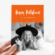 Ein tolles Halloween-Foto mit "Happy Halloween" in weißer Handschrift. Die Oberseite des Designs zeigt gesprenkelte orangefarbene Bluttropfen auf Ihrem Foto, die unten angezeigt werden. Personalisieren Sie die Vorderseite der blutigen Halloween-Karte mit Ihrem Namen. Auf der Rückseite der Karte befindet sich ein orangefarbener Hintergrund.