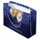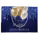 Eine Geschenktasche für eine gmädchenhafte und glamouröse Quinceañera, 15. Geburtstag. Ein marineblauer Hintergrund mit Tropfen aus dem Glitzer und goldenen Ballons. Die blaue Farbe ist ungleichmäßig. Personalisieren und fügen Sie Datum, Namen und Alter hinzu. Der Text: Der Name ist weiß geschrieben mit einem modernen handgeschriebenen Schrift