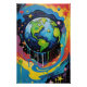 Ein auffallendes Bild des Planeten Erde wird mit lebhaften Tropfen, die von seinen Rändern kaskadiert werden, dargestellt, was eine dynamische, farbenfrohe Wirkung erzeugt. Die Tropfen verschmelzen nahtlos in den Hintergrund und geben den Eindruck, dass der Planet eine Leinwand inmitten einer künstlerischen Transformation ist.