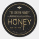 Schwarzes Etikett mit goldenem Text und Rahmen. HONEY wird in einer "geprägten" metallischen Goldneigung mit Honigglätten bedruckt. Ihr Farm oder Ihr Name ist in einem offenen Schriftart gedruckt. Nachbearbeitbarer Text unter dem Namen für den Ort oder Honigsorte. "reinrassig-lokal" kann auf ein oder zwei Zeilen zu Ort und Kontaktinformationen geändert werden. Bitte kontaktieren Sie den Verkäufer, wenn Sie Hilfe bei der Formatierung wünschen. Gute Bienenzucht!
