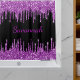 Ein schwarzer Hintergrund mit Imitaten Glitzer Tropfen in lila. Personalisieren und fügen Sie einen Namen, geschrieben mit einem mädchenhaften modernen handgeschriebenen Stil Skript. Lila Buchstaben.