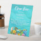 Bachelorette party "open bar" pedestal sign. Aqua blue "waves" design with a bottom border of specialty cocktails, hibiscus flowers and big leaves. Text is white with a blue drop shadow. Use to list alcoholic and non-alchoholic party / shower / reception drinks. This sign stands on its own and comes in four sizes. Make sure all text is away from the edges.