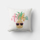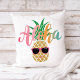 Tropisches, lustiges Kissen mit einem niedlichen, lächelnden Ananas, der eine Sonnenbrille trägt, mit einem Aloha Gruß in sommerlichen Strandfarben (Rosa, Korallen, Orange, Aqua Blau). Original-Kunstwerk KL Stock.