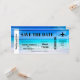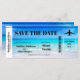 Ein tropisches Strandbild ist der Hintergrund für diese Boarding Pass Hochzeit in Urlaubsort Save the Date. Ein lustiges Ziel maßgeschneidertes Hochzeitsdesign. Tropischer Strand mit Aqua-Blues und modernem Text.