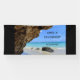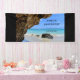 Business Banner mit landschaftlichem Naturfoto. Schönes türkisblaues Meer mit einem Sandstrand. Ein großer, brauner Felsen verleiht dem hellblauen Himmel Schatten.
