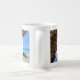 Eine Tasse mit einem landschaftlichen Naturfoto. Schönes türkisblaues Meer mit einem Sandstrand. Ein großer, brauner Felsen verleiht dem hellblauen Himmel Schatten.
