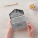 Tropical Beach, Ziel, schwarz und weiß, elegant, modern gefaltet Ehe, QR-Code Hochzeit alle in einer Einladung. Das dreifache, budgetäre Set. Sie können es mit Ihren eigenen Daten personalisiert.