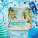 Diese elegante und schöne Hochzeitsplatte in Aquarellfarben bietet einen Strand, blauen Himmel und Palmen. Der Text kombiniert handgeschriebene Skripte mit serifenlosen Schriftart für ein stilvolles und modernes Design. Dies ist ideal für einen Sommerstrand oder eine tropische Hochzeit in Urlaubsort.