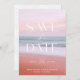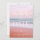 Tropischer Sonnenuntergang Speichern Sie die Daten. Das trendige Overlay-Design besticht durch einen schönen Sonnenuntergang und eine schöne moderne Typografie. Passen Sie Text mit Ihren Hochzeitsinformationen an. Ideal für die Hochzeiten am Strand!