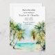 Diese elegante und wunderschöne Aquarelleinladung Save the Date mit einem Strand, blauen Himmel und Palmen. Der Text kombiniert handgeschriebene Skripte mit serifenlosen Schriftart für ein stilvolles und modernes Design. Dies ist ideal für einen Sommerstrand oder eine tropische Hochzeit in Urlaubsort.