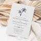 Diese einfache, minimale tropische Hochzeitseinladung mit zwei Palmen an der Spitze, mit klassisch elegantem Text, in einer weißen und marineblauen Farbe, mit der Koordinierung Marineblau auf der Rückseite.