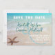 Starfish am Strand speichern Sie die Dattelkarten. Moderne Schriftart mit handgeschriebener Schrift für die Namen der Braut und des Bräutigams in der Mitte mit einem großen "und zeichen". Fett gedruckter weißer Text wird rechts unten auf der Karte angezeigt. Geben Sie Datum und Ort der Veranstaltung an. Kleinerer Druck für die letzte Zeile kann "Formal Einladung zu folgen" beinhalten. Die Farben sind blau, weiß und braun für ein naturgetreues Hochzeitsfest am Meer. Auch als Download verfügbar.