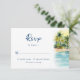 Das tropische Thema Hochzeit RSVP Gehäuse Karte verfügt über einen Aquarellsonnenuntergang, Palmen und ruhiges türkisfarbenes Meer. Auf der Rückseite befindet sich ein elegantes Monogramm aus Palmen in tiefblau mit Vornamen-Initialen, die personalisiert werden können. Kunst von KL Stock