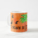 Der Strand ist meine Therapie. Eine Menge tropischer Tasse mit dieser Palme auf der Insel und Seegras. Heisser, orangefarbener Hintergrund, eine farbenfrohe grüne Palme, einige umkreisende Möwen und schwarzer Text, den Sie mit einem Namen oder einer Nachricht Ihrer Wahl personalisieren können.