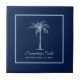 Fügen Sie Ihre eigene Touch zu diesem schlicht eleganten Design mit Ihrem Familiennamen oder Phrasen und etablierten Datum in hellen aquamarinen Text und Palmen gerahmt in einem hellen, aquamarinen Rand über einem marineblauen Hintergrund.