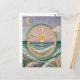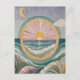 This vibrant, illustrative piece combines nautical scenery with mystical celestial symbols. At its center, a large circular window frames a tranquil sunrise or sunset over rolling ocean waves, rendered in a soothing palette of teal, seafoam, and lavender. Outside this frame, lush tropical foliage and palm fronds anchor the foreground, while the upper sky transition into a twilight scene featuring a golden crescent moon and shimmering stars. The artwork utilizes a mix of flat graphic shapes and soft watercolor textures, creating a peaceful, dreamlike coastal atmosphere that feels both modern and mythical.
