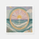 This vibrant, illustrative piece combines nautical scenery with mystical celestial symbols. At its center, a large circular window frames a tranquil sunrise or sunset over rolling ocean waves, rendered in a soothing palette of teal, seafoam, and lavender. Outside this frame, lush tropical foliage and palm fronds anchor the foreground, while the upper sky transition into a twilight scene featuring a golden crescent moon and shimmering stars. The artwork utilizes a mix of flat graphic shapes and soft watercolor textures, creating a peaceful, dreamlike coastal atmosphere that feels both modern and mythical.