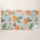 Dieses Badetuch ist mit illustrierten Orangen, tropischen Blume und Blätter auf hellgrünem Hintergrund gestaltet.