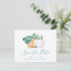 Ankündigen Sie Ihre Babydusche mit meinen tropischen Save the Date Einladungen mit den Worten Rett Our Date in einem trendigen Schriftzeichen-Stil, der das Aussehen der Handschrift erinnert. Diese einfache Karte zeigt eine Nachbildung meines original Aquarellfuchs mit Monstera-Blätter und weißem Kürbis mit Ihren Namen, Duschdatum und Ort. Die Karten werden in eine solide, türkisblaue Farbe umgetauscht. Ideal für tropische Babyduschen im September, Oktober und November. Weitere Designs von Victoria Grigaliunas finden Sie unter www.zazzle.com/dotellabelle.