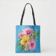 Personalized tote bag with big flowers design. All over print with pink and yellow hibiscus flowers. More little flowers and leaves make up this pretty design which has a background of blue wood grain. Include a name down the side of the front in elegant script font. This tote is lined and also comes as a cross-body bag with dividers inside. This large tote would be a wonderful gift for members of the bridal party.