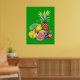 Poster in a collage of colorful tropical fruits including pineapple, papaya, mango, gogi berries, kiwi, and lime, with a tropical theme of rich textures and lush foliage.