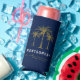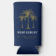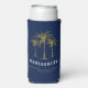 Customize this tropical navy blue and gold can cooler with your own special touch. This elegant design features your family name and reunion date under three artistic golden palm trees.