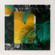 Challenging square jigsaw puzzle for adults feature rustic gold yellow squares nestled in a grey tropical pattern with large green palm leaves overlaying it.