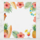 Vibrant tropical border frame bursting with watercolor hibiscus flowers in bright coral pink and sunny yellow, lush green palm leaves, juicy pineapple slices, classic surfboard, flaming tiki torch, refreshing pineapple cocktail with umbrella and straw, colorful lei garland, and fresh citrus accents.