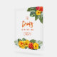 Opaque acrylic bar sign for a tropical themed wedding reception or other event. Yellow and orange hibiscus flowers and big leaves decorate this 8x10 inch sign with red-orange text. Purchase with a wooden holder, or not.