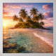 A tropical landscape featuring a small island surrounded by crystal-clear waters and palm trees glowing under a warm sunset. The blend of golden skies, turquoise sea, and lush vegetation creates a peaceful and dreamy atmosphere, evoking escape, relaxation, and the beauty of a natural paradise.