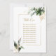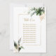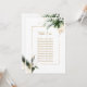 This wedding seating chart table card features watercolor green tropical foliage, palm tree leaves, banana leaves with gold script, and a gold rectangle frame. It's perfect for a beach or destination wedding.