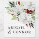 Elemente: Aquarellmagnolien mit grünem und rotem Blattwerk, moderne Schriftart. Farben: weiß, grün, rot, krümelig. Themen: Modern, lustig, Sommer, Ziel, Strand, Palmen, Regenwald, botanisch, floral. Sammlung: Tropisches Magnolia Sortiment von weißer grüner Hochzeit in Urlaubsort: Weinetikett