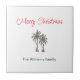 Tropical Beach Frohe Weihnachtsfliesen, mit einer Palmen Illustration und Schrift Typografie. Mit anpassbarer Schrift fügen Sie Ihre eigenen Informationen hinzu. Eine festliche Ergänzung zu Ihrem Küchenurlaub-Dekor.