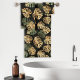 Dieses Set mit Handtuch ist in grün-bräunlichen tropischen Monstera-Blätter auf schwarzem Hintergrund gehalten.